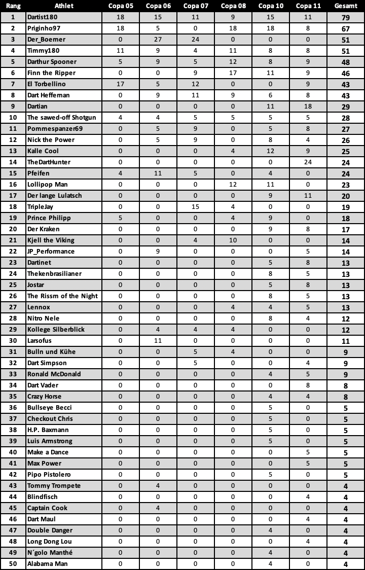 Insgesamt wurde in der ersten Copa-Saison drei Mal das Maximum geworfen - für zwei 180 war Der_Börner verantwortlich, eine geht auf das Konto von El Torbellino aus Mexiko. Alle sportlichen Geschehnisse, Statistiken und Erfolge können nachfolgend eingesehen werden.