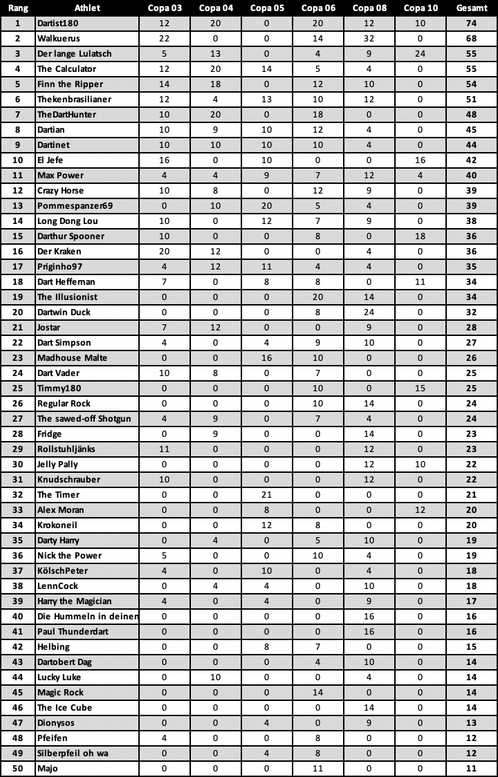 Insgesamt wurde in der ersten Copa-Saison sechs Mal das Maximum geworfen - TheDartHunter, Walkuerus, The Ripper und The Calculator warfen alle mindestens eine 180. Alle sportlichen Geschehnisse, Statistiken und Erfolge können nachfolgend eingesehen werden.